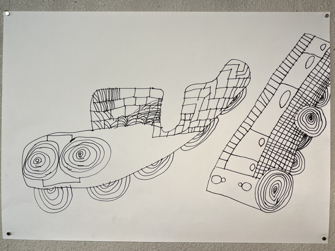 昨年のお出かけ企画でトヨタ博物館に行った後、たくさん車の絵を描かれました。パンフレットを見られ「どの車にしよう」と選びながら…。その中の1枚です。