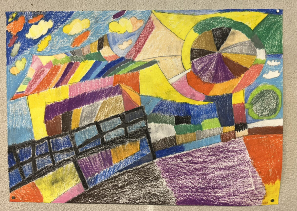 これもお出かけ企画で山岡のおばあちゃん市へ行った後に描かれた作品です。水車がとても印象に残ったようで、この絵を描かれました。智美さんらしいカラフルな色使いが素敵ですね。