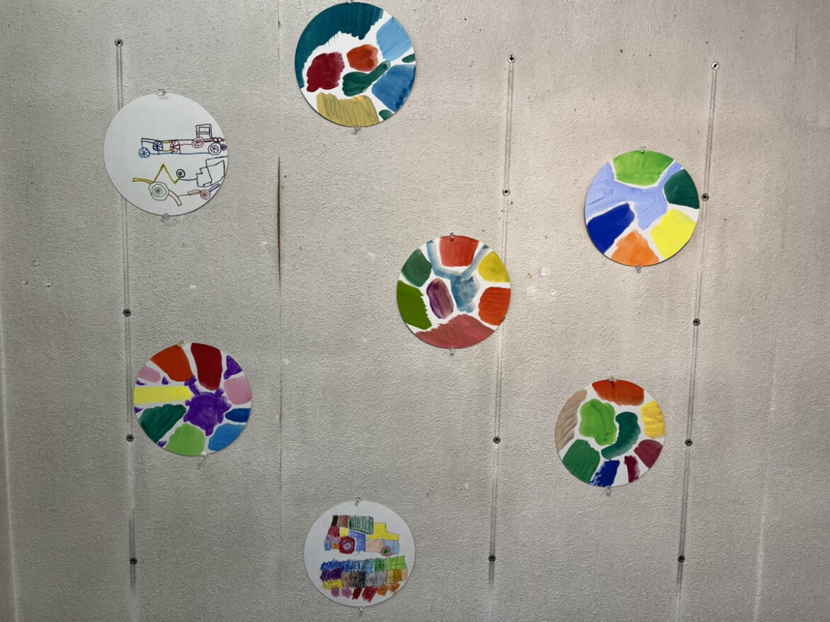 こちらは寄付でいただいた丸い厚紙に自由に描かれた作品です。智美さんがいつも創作するスペースの壁に飾っています。