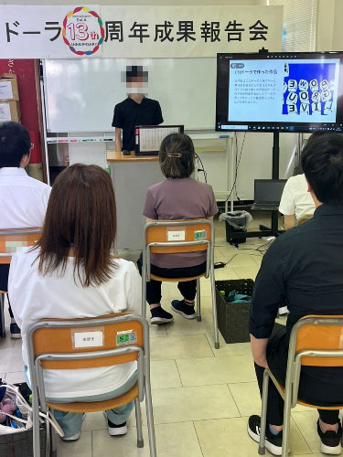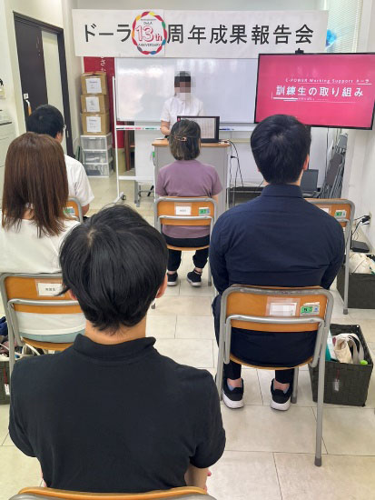 成果報告会には訓練生の保護者をお招きして開催しました。訓練生達は、普段と違う雰囲気のドーラに緊張している様子でしたが発表が始まるとリハーサルの成果もあり堂々と発表することができ、大成功に終わりました。
