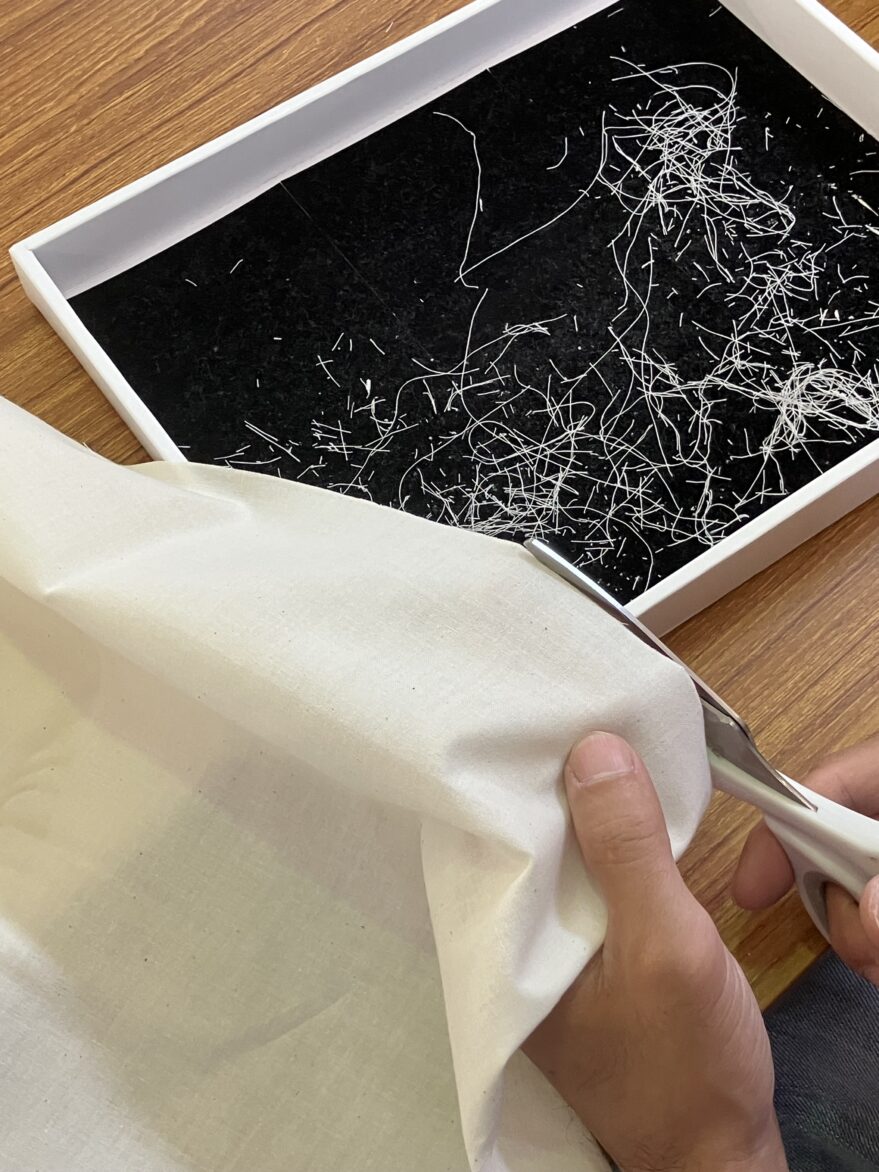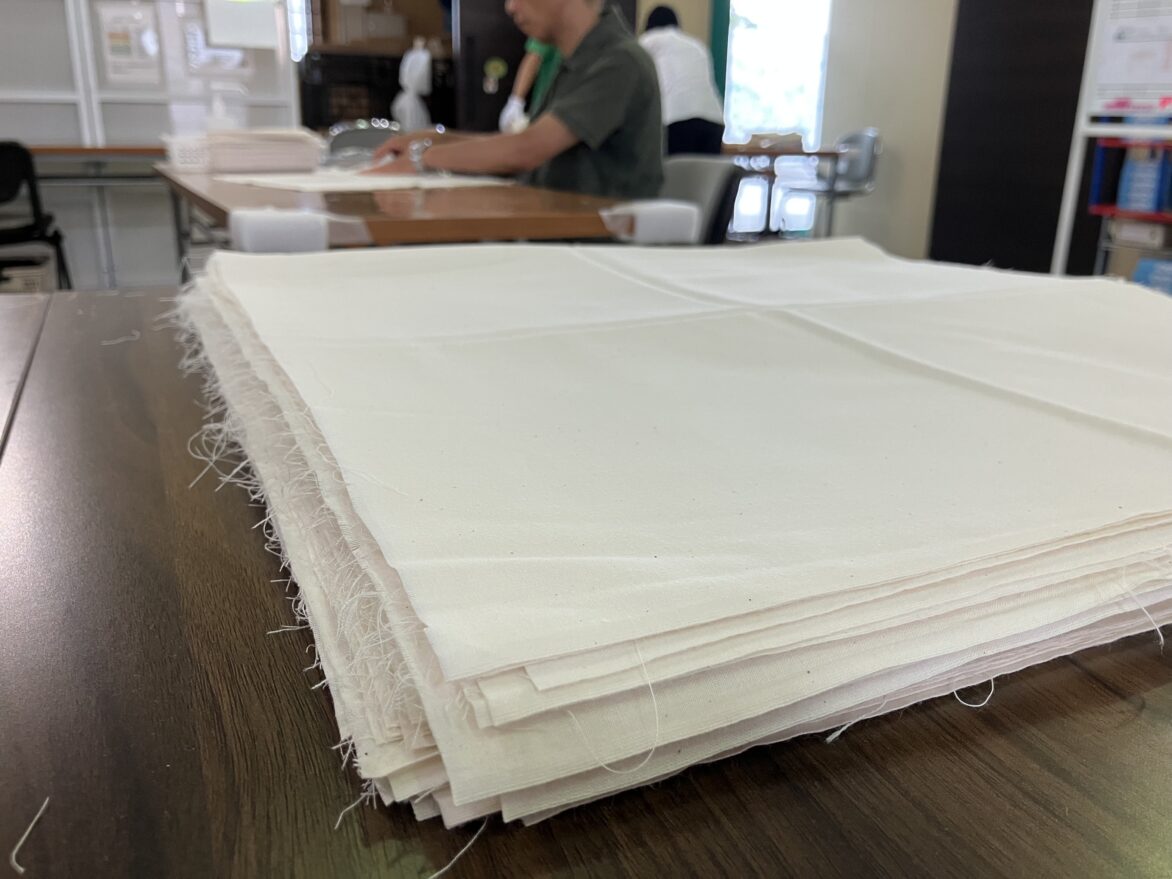 今回は、その布をさらに半分にカットして、きれいな正方形に整える作業に取りかかります。