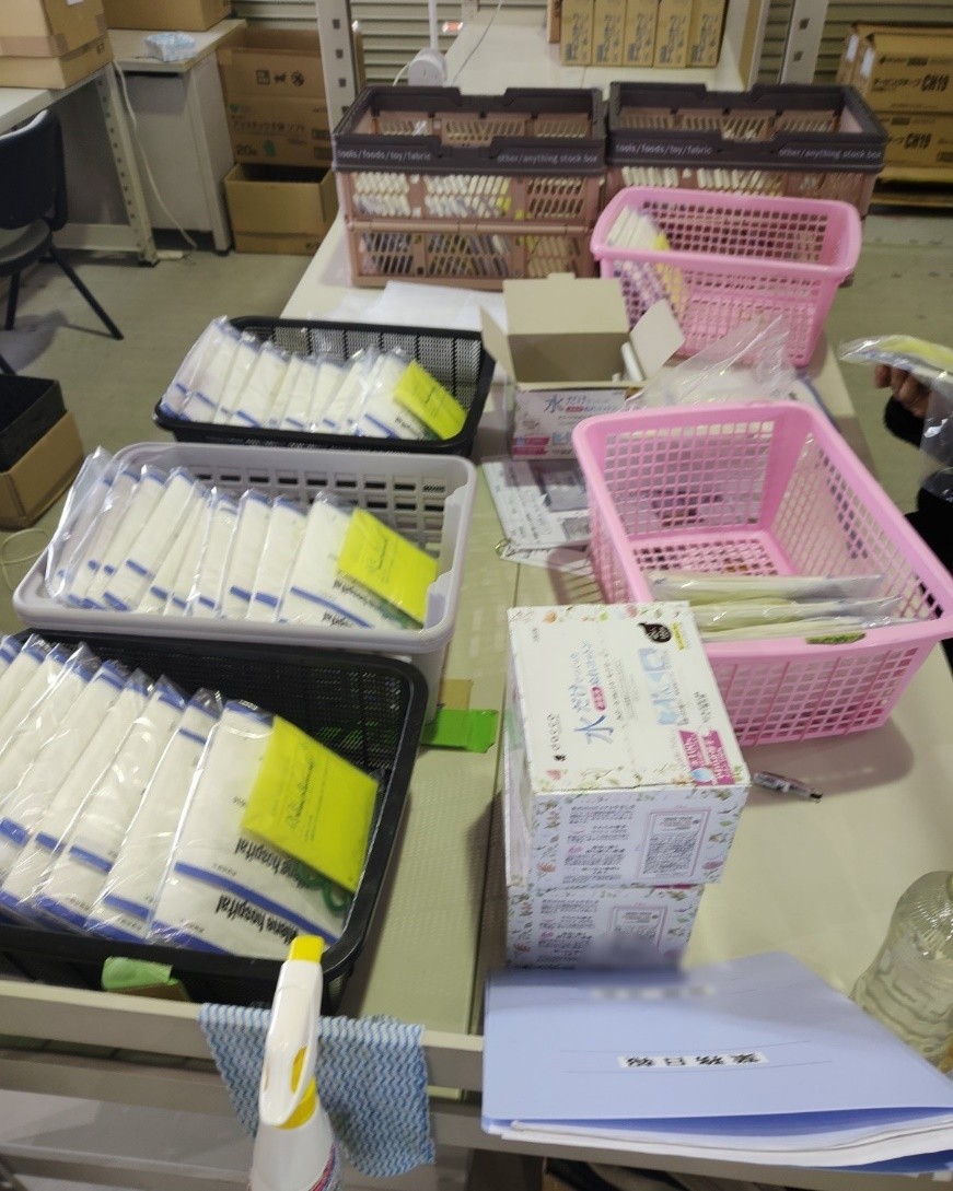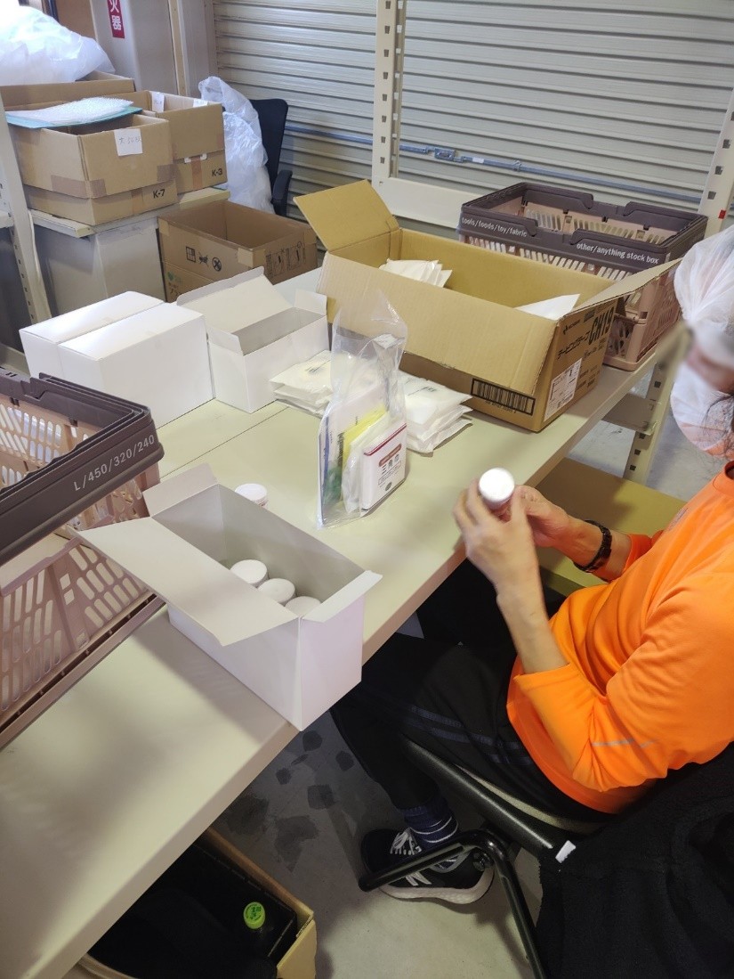 以前は、一つの袋に10点の応急セットをまとめて入れていましたが、現在は一種類ずつ袋に入れ、順番に進めています。その都度、職員が確認を行いながら進めるので、安心して作業できます。