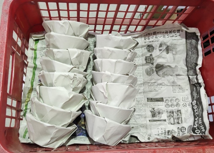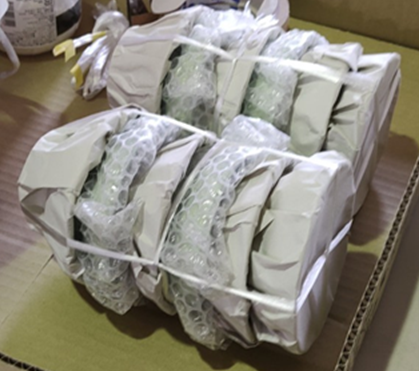 今まで数種類の陶器の梱包をしましたが、今回はアイス皿を一つ一つ丁寧に緩衝材で包み、6個一組で紐で縛り、段ボール紙で包みました。